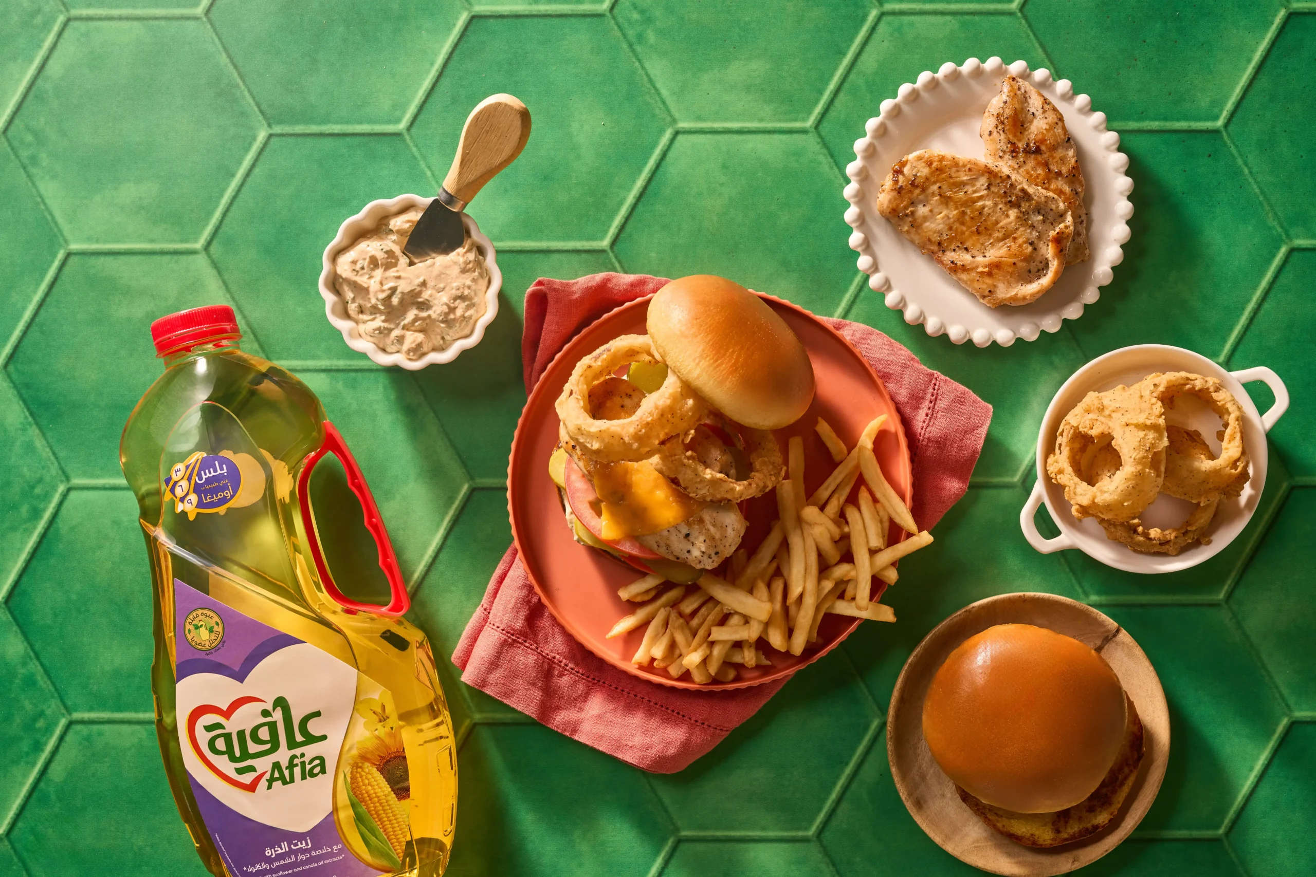 For the onion rings, heat oil in wide frying pan. Meanwhile in a wide bowl mix flour, spices and beer and whisk until you reach a creamy thick texture, in a separate wide bowl add panko.