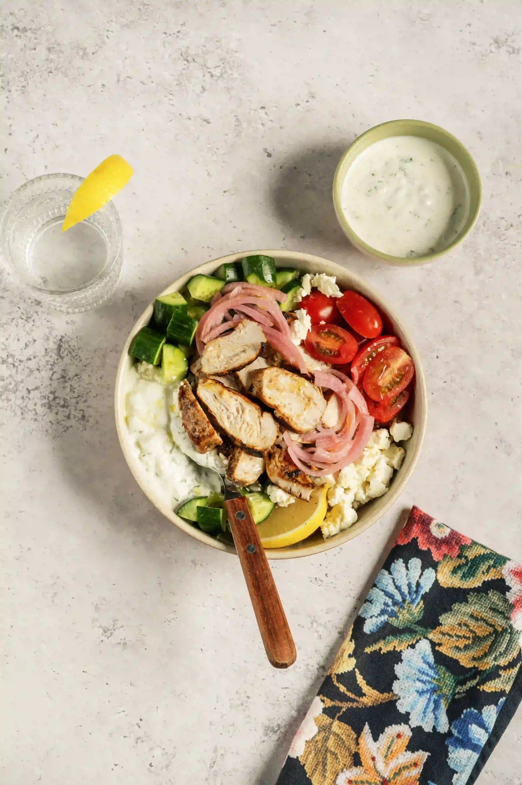 • Add the cucumber, cherry tomatoes, crumbled feta cheese, and pickled onions.
