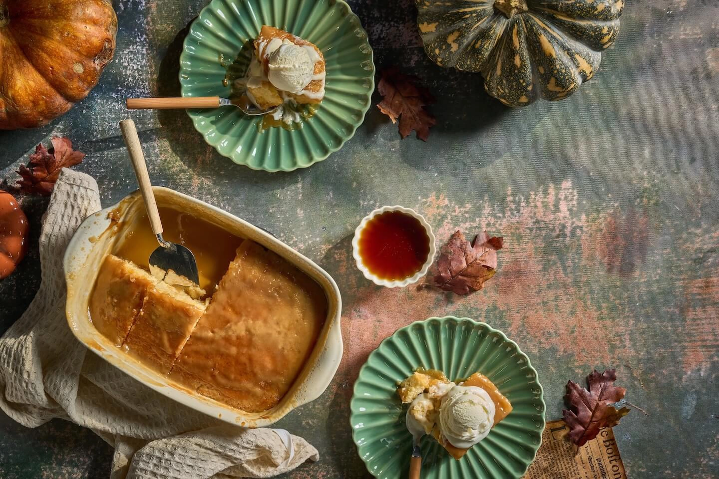 • For the sauce, in a saucepan, whisk together the maple syrup and heavy cream. Bring to the boil, whisking occasionally. Turn off the heat and pour the sauce into the prepared cake tray.