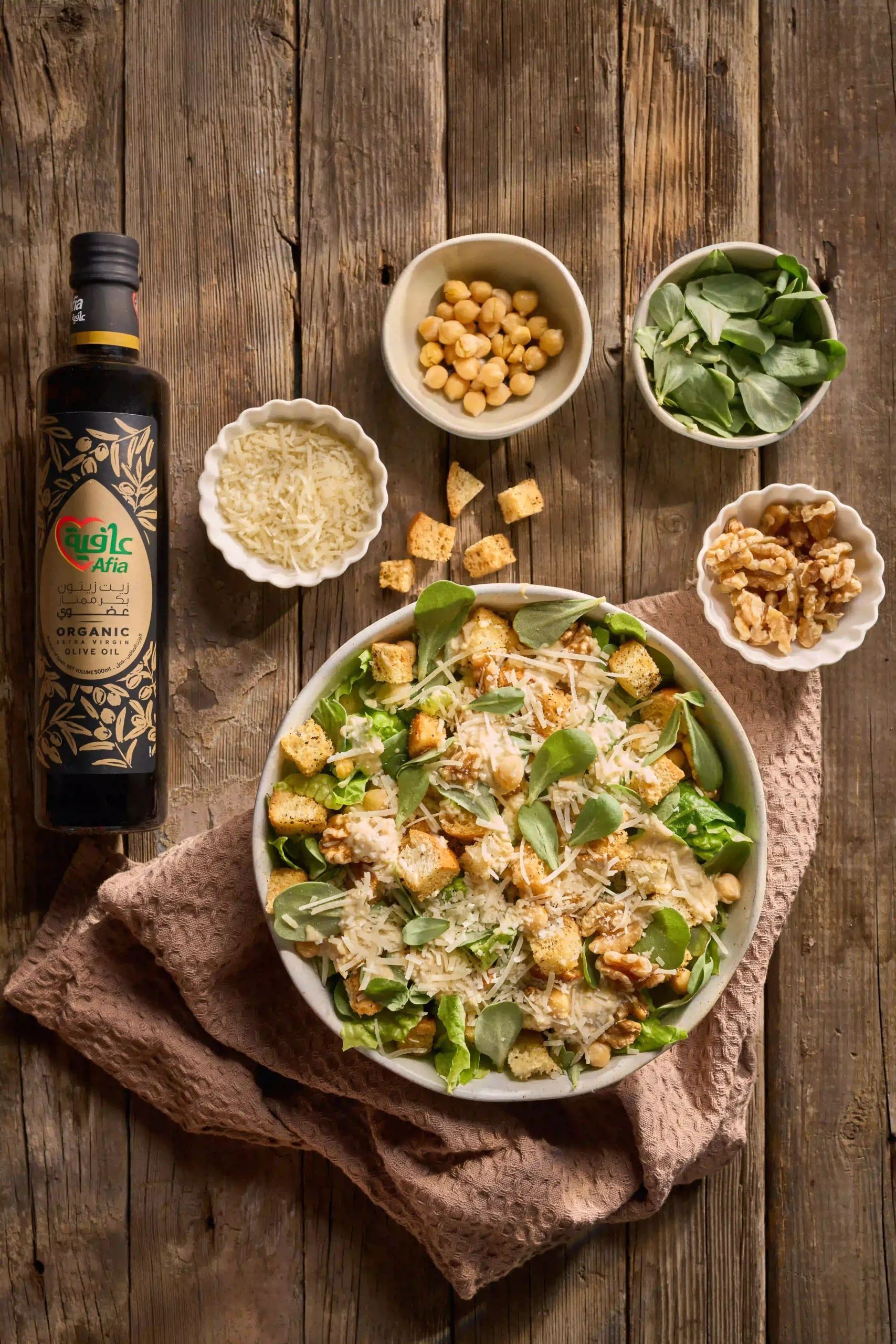 Salad: 2 cups Purslane 3 cups Romanian lettuce ¼ cup Chickpeas, cooked 1 cup Croutons, roasted ¼ cup Afia walnuts, chopped 2 Tablespoons Parmesan cheese, grated